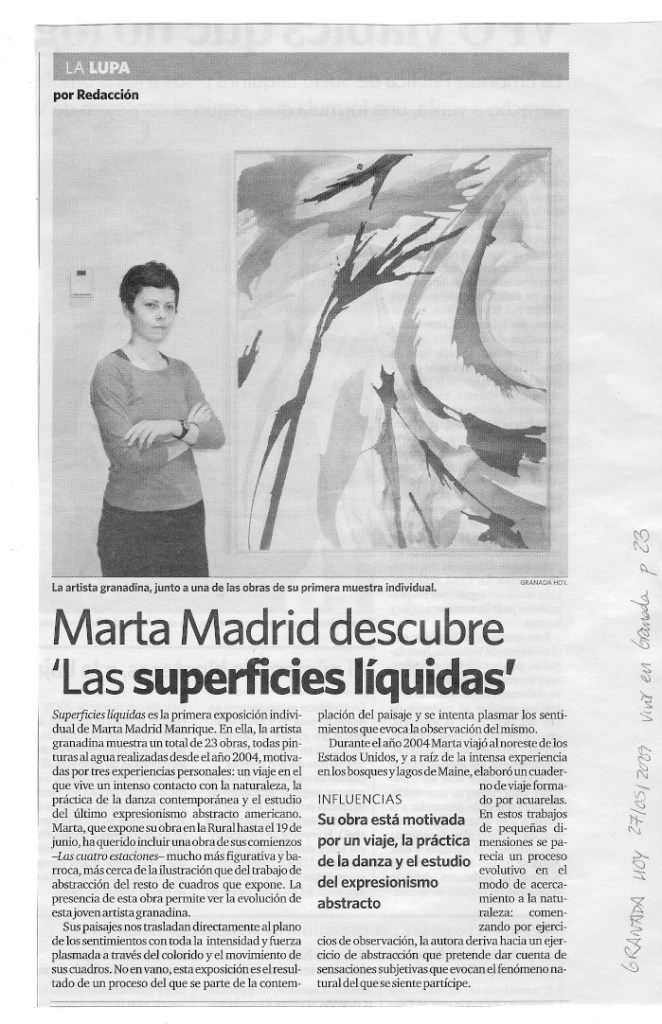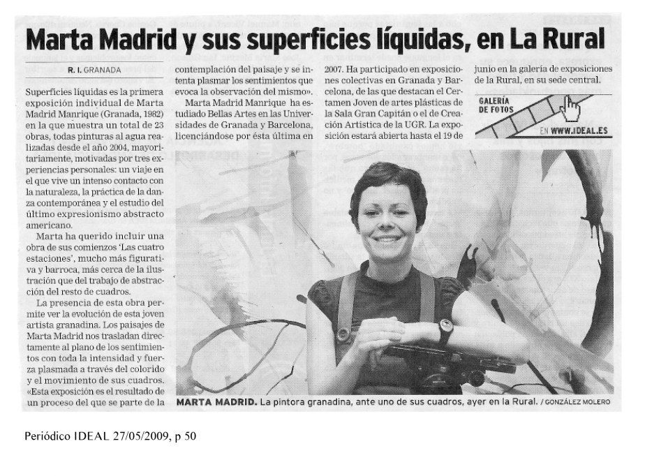 During my Fine Arts studies, I developed a painting work based on the exploration of colour, nature, movement and fluid. This was my first solo exhibition “Superficies Líquidas” (Liquid Surfaces) in 2007 in Granada, Spain (Sala Caja Rural).
