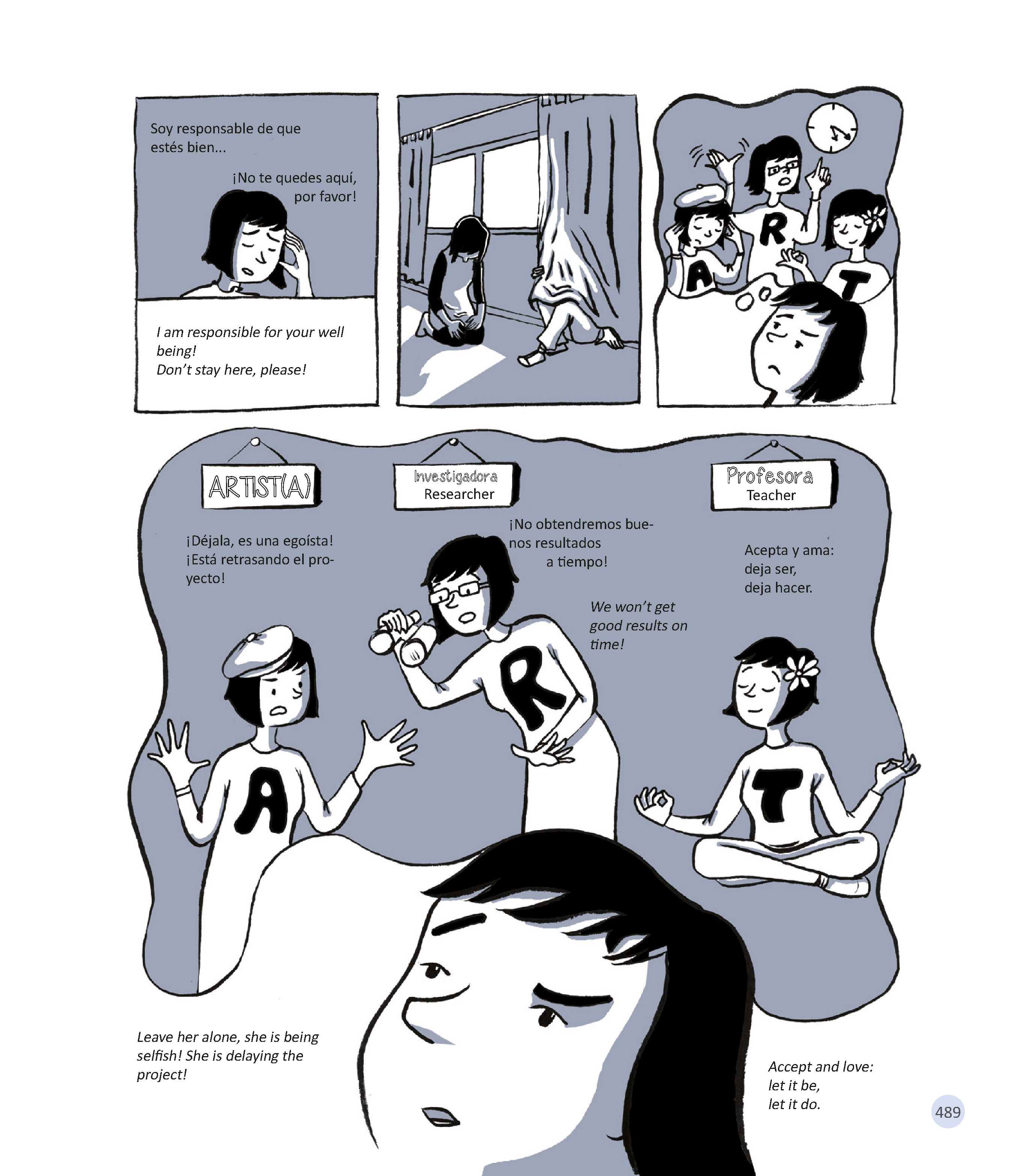 A/r/tography is present in the comic when the main character struggles with her expectations during the workshop. I drew a dialogue between the three characters of the artist, researcher and teacher inside her head to reflect on the tensions between the three ways of being. I used a curvy line in the panel to communicate that this was a mental space. The curvy panel had the three characters -the artist, the researcher and the teacher- with three different voices. This allowed me to reflect on the complexities of inclusivity from the three different identities or point of views, and the strong tensions and differences between them.