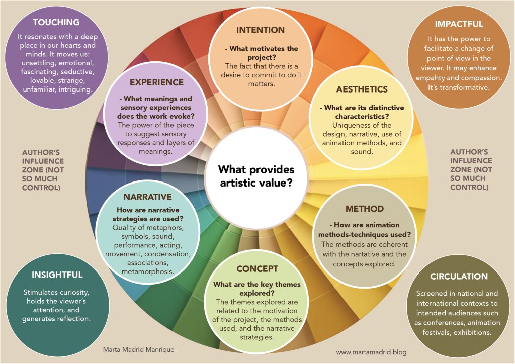 In my vision, there are six aspects that provide an animated project with artistic value within the artist’s area of control: the intention or motivation behind the project, the aesthetics or design constraints, the animation methods used in relation to the concept to be explored, the narrative strategies, and the experience to be provided for the intended audiences.